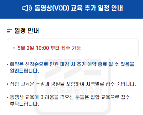 - 동영상(VOD) 교육 시작: 동영상 교육은 5월 17일부터 제공되기 시작합니다. 이 온라인 교육은 집합교육에 참석할 수 없는 분들을 위한 대안으로, 편리하게 언제 어디서나 교육을 이수할 수 있는 방법을 제공합니다 (네이버 블로그).